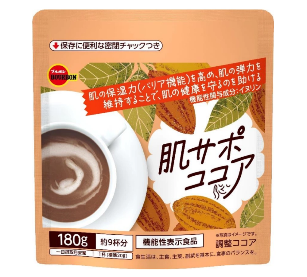 ブルボンの「肌サポココア」は、水溶性食物繊維イヌリンを配合した機能性表示食品。1杯で肌の保湿力と弾力を内側からサポート。お湯や牛乳に溶かして飲むだけで、コクのある味わいと美肌習慣を同時に楽しめますよ~